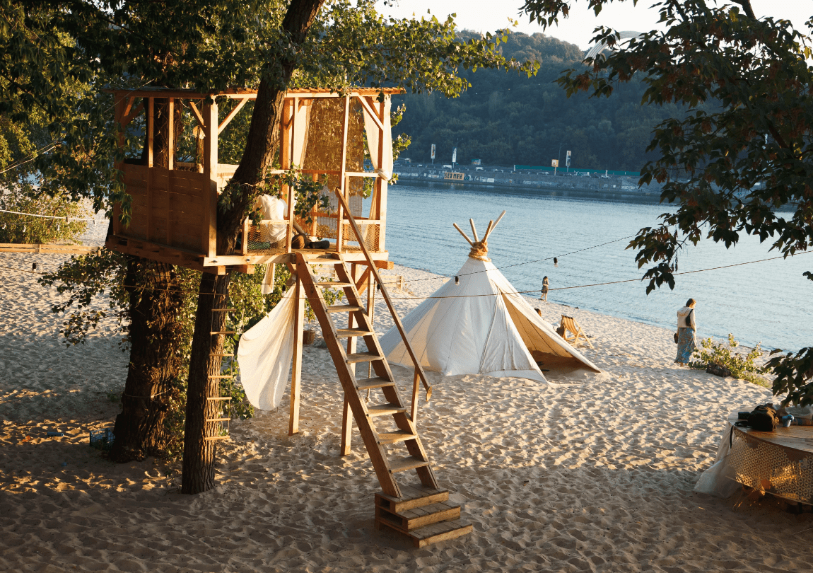 Местом расположения объекта был выбран киевский Гидропарк. Таким образом, кроме должной рабочей атмосферы, пользователь получает ряд других выгод. Среди них: близость к реке Днепр, недалеко от станции метро Гидропарк, возможность посетить кинотеатр, а также никто не будет против, если вы возьмете с собой детей. Но главной особенностью этого коворкинга является сортировка отходов. То есть это место полностью свободно от мусора. Это следствие главного принципа, который закладывается в идею коворкинга на природе. В дополнение к этому, на локации предлагается заниматься йогой и медитацией и употреблять здоровую пищу. Принцип устойчивости и гармонии с природой прослеживается в каждой составляющей этого коворкинга.