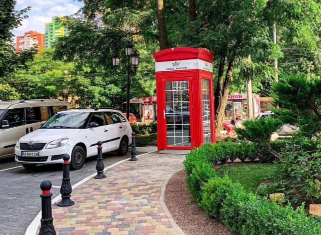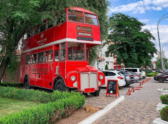 На території є кілька червоних телефонних будок, а біля парковки стоїть двоповерховий англійський автобус, який немов нещодавно їздив вулицями Лондона. Гості ЖК «Нова Англія» навіть не здогадуються, що це не лише декорація. Всередині облаштована кав’ярня. Тут можна замовити каву або інший напій.