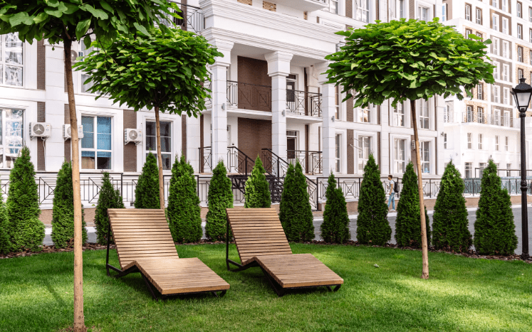 Порівняно з багатьма житловими комплексами тут відчувається затишок і гармонія з природою. Літо — ідеальна пора, щоб сюди завітати. Навколо помітно квіткові клумби, туї, кущі й інші об’єкти ландшафтного дизайну.